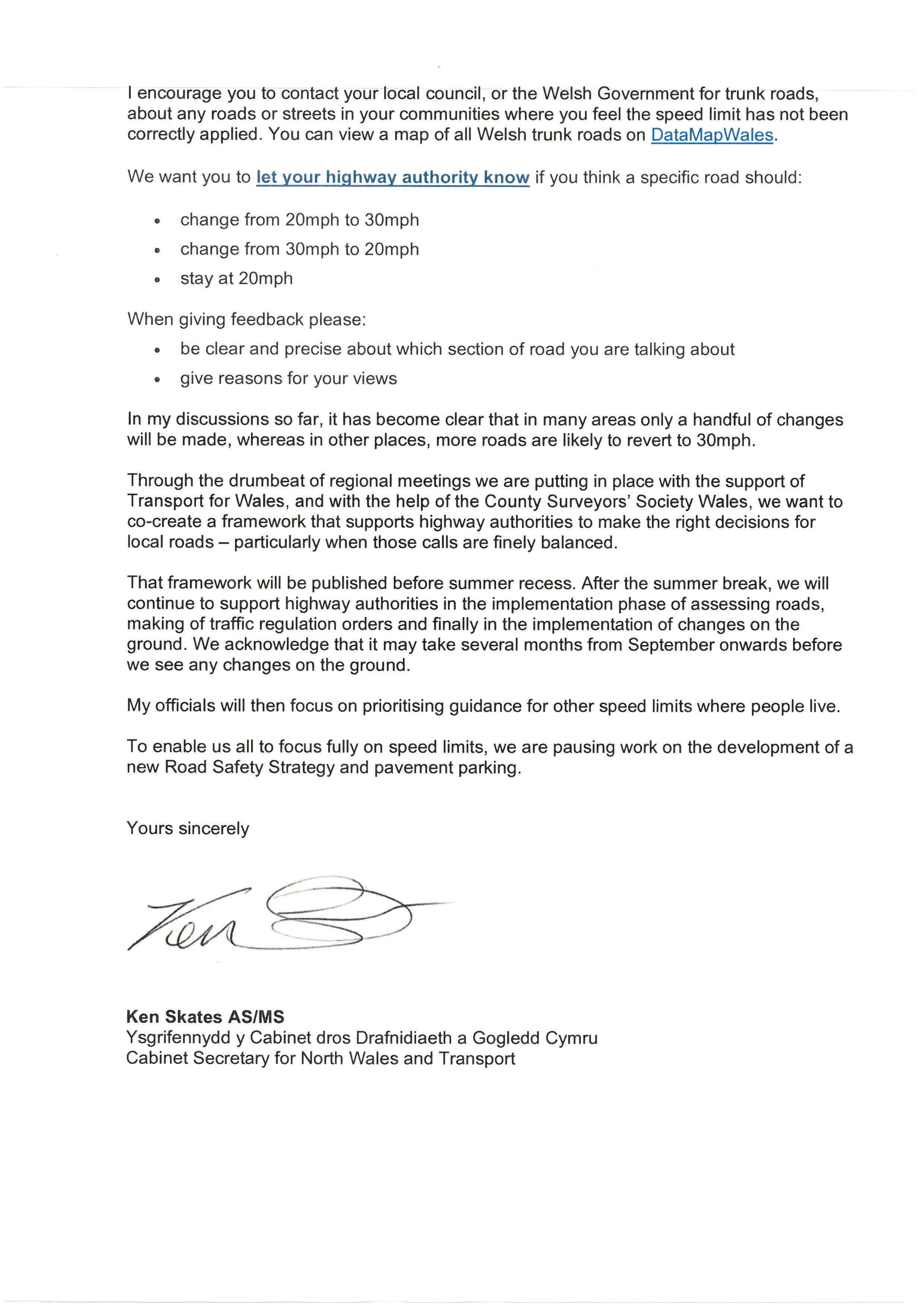 “The Welsh Government has no power to set individual speed limits, other than on the strategic roads that they directly manage. It is your local council that has the power and responsibility to set a local limit that is different from the national 20mph default.